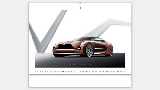 The ALPRA DESIGN 2020 calendar displays 12 different ideas of different cars in a dynamic and elegant way.